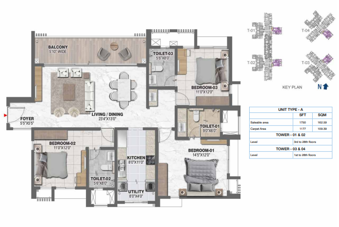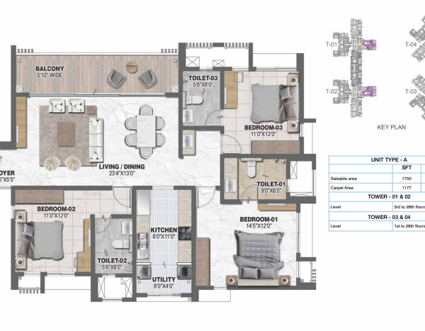 The unit is a compact 3BHK apartment with a super built-up area of 1750 sq. ft.